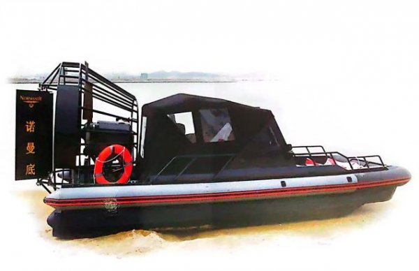 船體采用pvc為主體,外覆防彈材料。美國進(jìn)口300HP發(fā)動機(jī)、碳纖維螺旋槳、減速箱,船底用高性能耐磨復(fù)合材料。